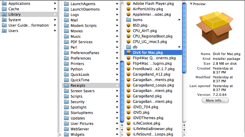 And there is NO MENTION of any folder in Application/System Preferences/Divx, nor in Receipts.