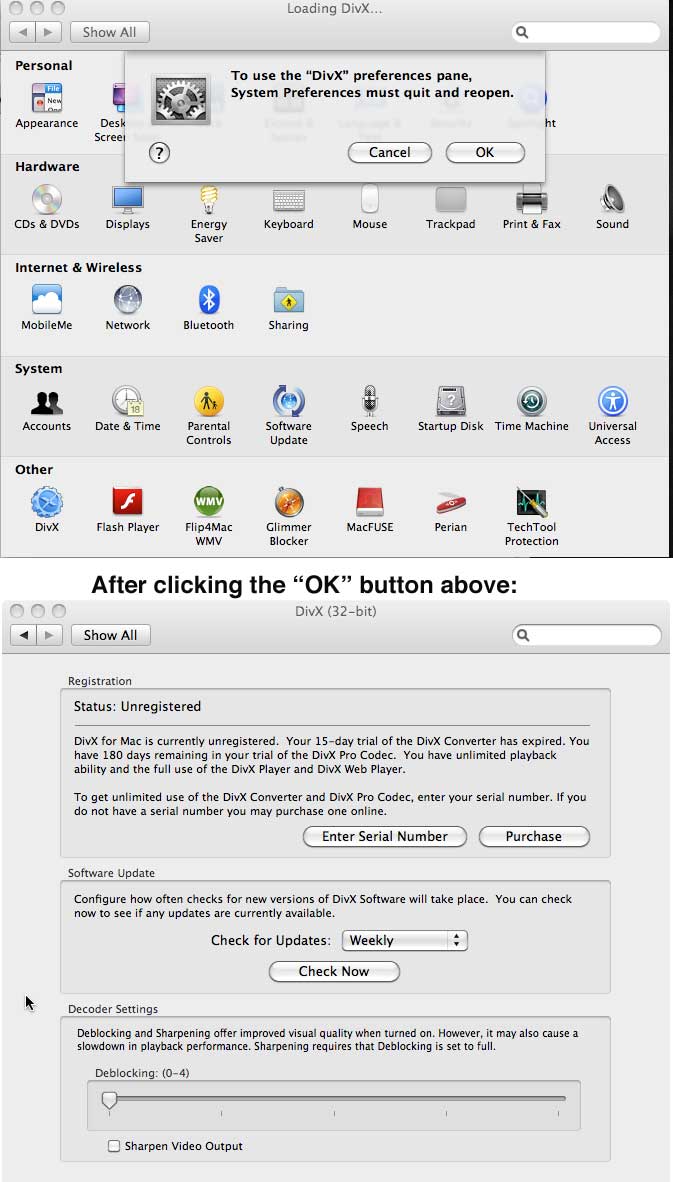 Going to the DivX.prefpane (there are 2 becayse Spotlight's picking up the one on the Time Machine backup, too), gets you this: