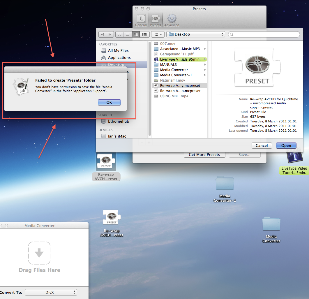 (I haven't used this tip, but I think on another Lion Mac I just copied the preset manually in the presets folder (.../Library/Application Support/Media Converter/Presets) double-clicked and saved it.)