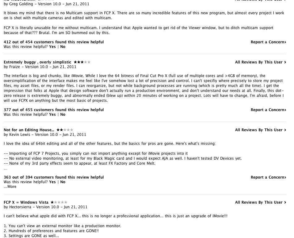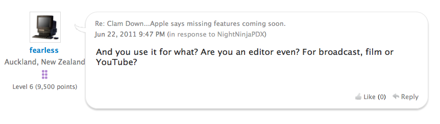 I have yet to purchase it. As a freelancer, I consider myself a professional editor and have been in love with FCP since v 1.2. I'm interested primarily in speeding up the process. I learned a long time ago that FCP is a swiss army knife (lot's of features, but really just good for editing). Sure you can do some compositing in FCP, but that's what Motion and AE are for. Sure you can edit your audio clips and record VO in FCP, but that's what ProTools or STP are for. So FCPX is missing certain things that people had grown acustomed to. That's bad.