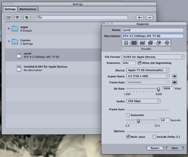 5> Here's where you decide based on the actual pixel shape of your source .dv file videos. In my case, it was 720x480, so I selected "Apple TV SD (anamorphic)" as the "device", and the "aspect ratio" as "4:3". You pick the setting based on whatever your DV files are. If you don't know, use quicktime pro "Inspector" window to discover, or download VLC from videolan and use that. They both play and show you the pixels, etc of your .dv file. Whatever the shape, make sure the aspect ratio you choose in the setting is the same as the original source.