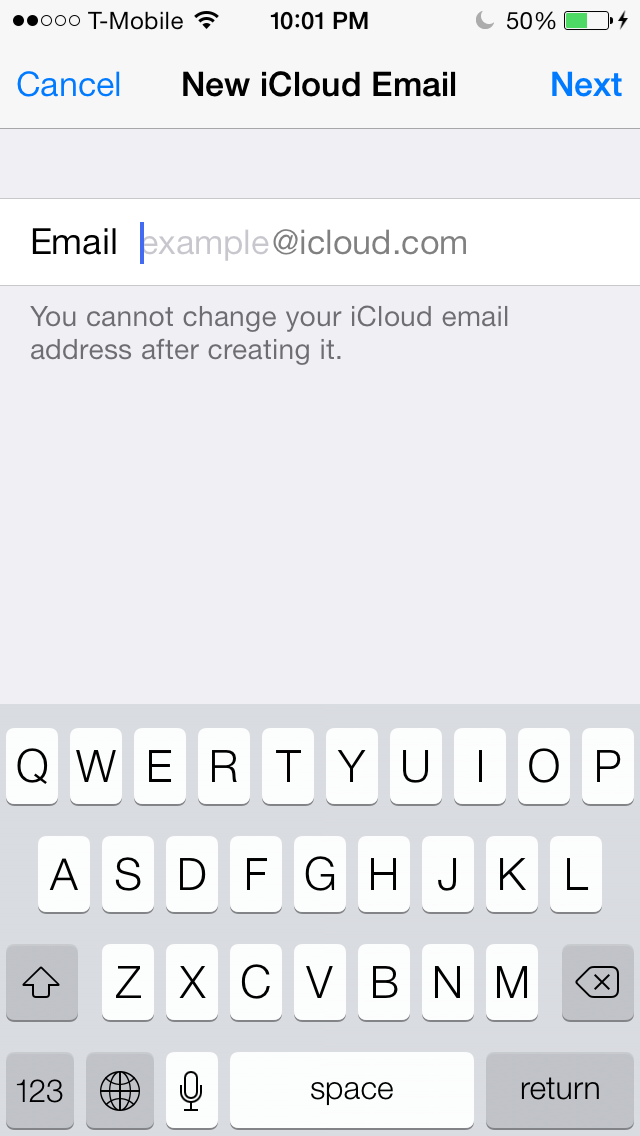 The next screen (not shown) confirms that the desired icloud.com address is available and again states that the icloud.com email address cannot be changed once it is created.