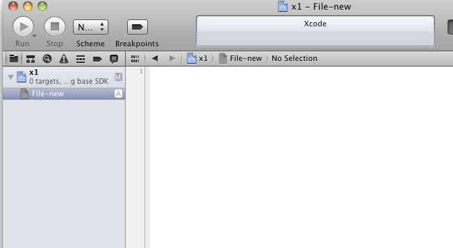 I use Xcode 4.0 as an editor for stand-alone C++ programs. In earlier versions, I would just open a new empty file (cmd-shift-N, I think; the new file option, which was just cmd-N, gave me something else) and start typing. But in v. 4.0, I haven't found the option to do this. Under File->New, it only offers me the option of new project or new workspace. There is an option for new file, but it's grayed out. So what I have to do now, to get a new empty editor file, is open an existing C++ program in Xcode, delete the contents, and save it under a new name.