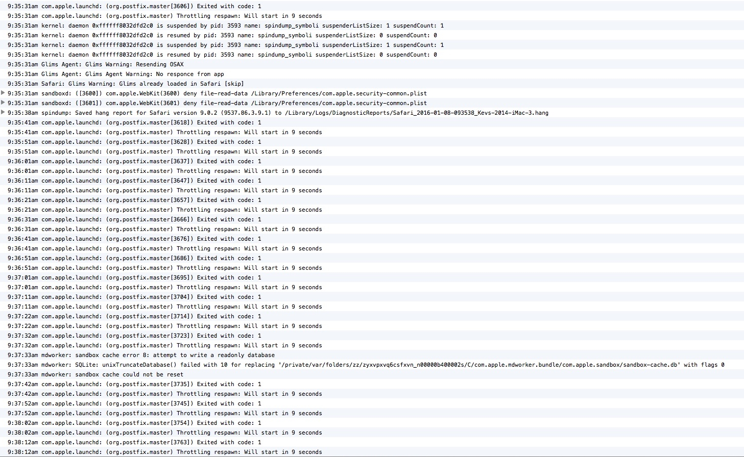 Oct 13 23:54:55 iMac27 kernel[0]: Sandbox: sandboxd(2164) deny mach-lookup com.apple.coresymbolicationd