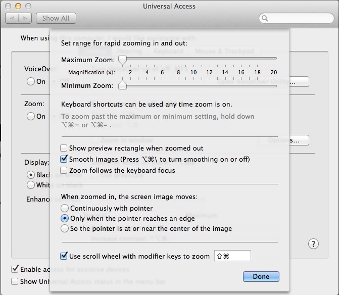 I'm just wondering why my svreen zoom works sometimes. I have it set to follow the cursor when it reaches the edge ofthe screen but it does not do it. It is very frusturating. I need this to work so I can see my cpu screen. Also it stops working all together sometimes and comes back all of a sudden. does anybody know why this is happening. I have a magic mouse and a mid 2007 iMac with 4gigs of ram.