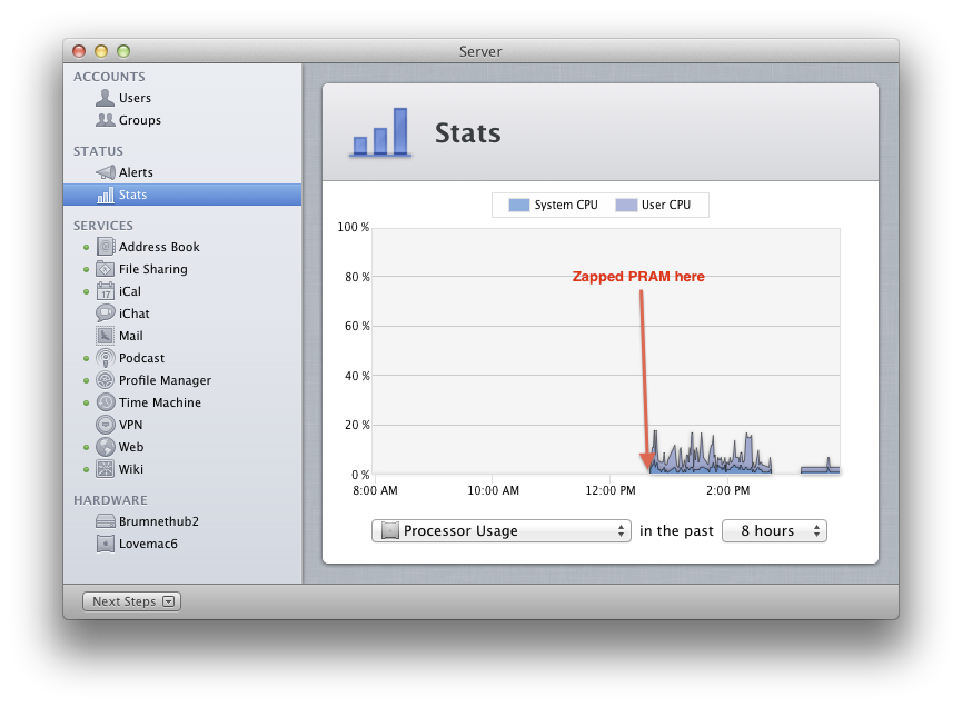 After upgrading to Lion Server from Snow leopard server the status graphs for cpu, memory and network usage just appear as blank windows.. any know how to restart them or get them to show?