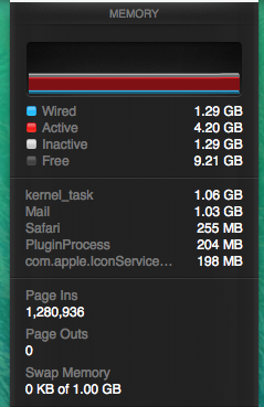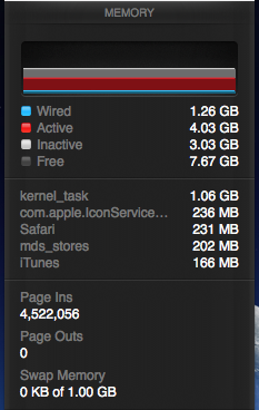 To summarize my setup: 2012 Mac Pro with OS X on an SSD and 16 GB of memory. At this very moment I have my usual programs open - Safari, Mail and iTunes. Here's a shot of my memory after 4 days and two hours.