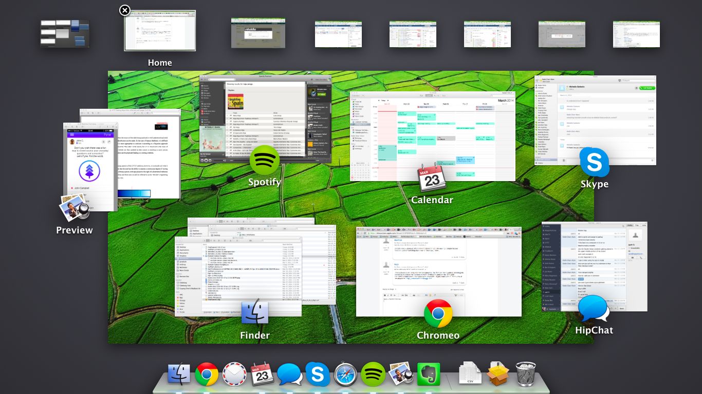 This really help me now because it's easy to find the correct desktop now. If the application is not running I can tell which desktops are "reservered" for Photoshop or Illustrator. I can also quickly find my Dreamweaver desktop because for some reason Dreamweave does not give me a preview of the open windows when it's open. I'm always guessing which desktop it's on when switching between application.