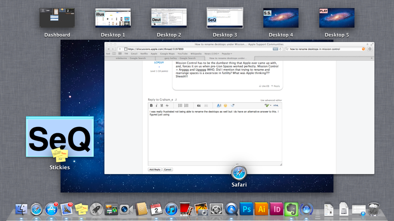 This really help me now because it's easy to find the correct desktop now. If the application is not running I can tell which desktops are "reservered" for Photoshop or Illustrator. I can also quickly find my Dreamweaver desktop because for some reason Dreamweave does not give me a preview of the open windows when it's open. I'm always guessing which desktop it's on when switching between application.