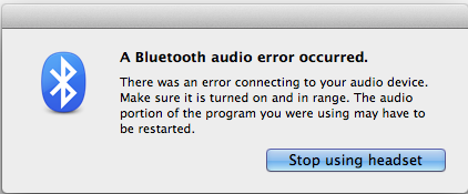 7/22/11 3:21:11.000 PM kernel: REQUIRE failure: result == kIOReturnSuccess - file: /SourceCache/IOBluetoothFamily/IOBluetoothFamily-2500.4.17/Core/Family/Drivers/ IOBluetoothSCOAudioDriver/IOBluetoothSCOAudioEngine.cpp:270