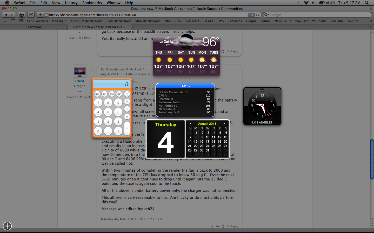 Has anyone on this thread downloaded the new software update yet? Did that help? My replacement 2011 Air just came today and I'm in the process of re-installing all my apps right now so I haven't done the upgrade yet. I have to say that so far I am sorely disappointed by Lion and by this new Air compared to my 2010 C2D Air. This thing is constantly, and I mean constantly hot, when I'm just browsing the internet. If it weren't for the backlit keyboard which I really need, I wouldn't have upgraded. Arrrgh!