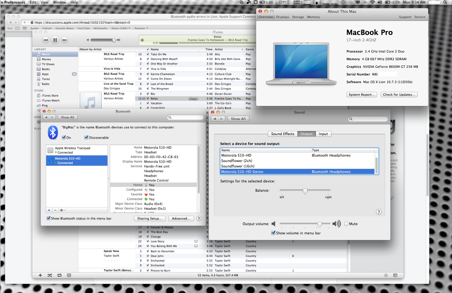 Just bought the Moto S10-HD BT wilresles headset and ran into the same BT audio error as was posted here. Im running a Feb 2008 MacBookPro3.1 (with replaced nVideo GeForce video chip) on the latest Lion MacOS release. The laptop was able to discover the headset, but wouldnt play any audio. When I ran iTunes with music, soon the error popup would show and it would disable the paired BT headset device.