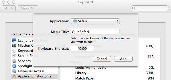 Under Application Shortcuts, click "+" and add for Safari a new combination for Quit Safari (Choose under Menu title "Quit Safari", exactly like in the menu from Safari, and press 'option-command-Q" under Keyboard Shortcut). Do the same for "Quit and Close All Windows" but chosing command Q as keyboard shortcut.