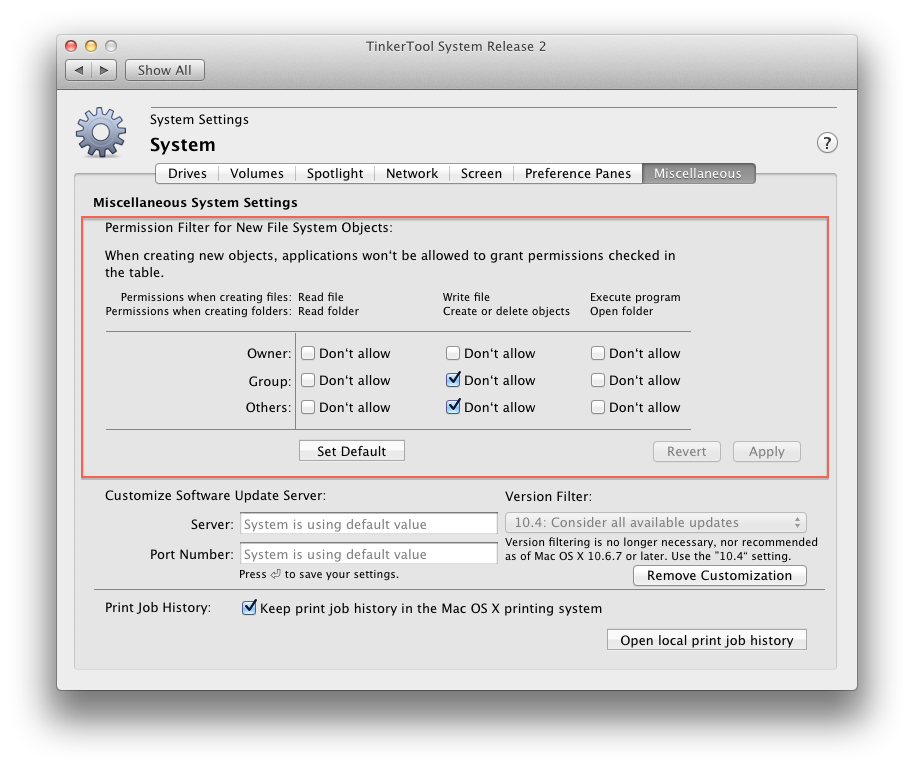 Another way documented in various places and which I actually used through OS X 10.6 was also done via Terminal. Two files were created: /etc/launchd.conf (for system-wide global umask) or /etc/launchd-user.conf (for user-specific global umask). The contents of each were simply the single umask command, "umask 002" or ("umask u=rwx,g=rwx,o=rx", I can't remember which variant I used - they're functionally the same, though).