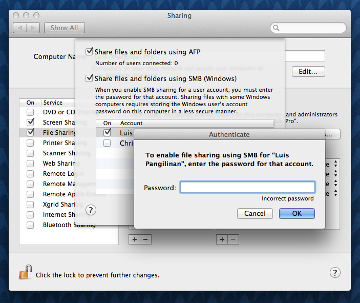 I'm not sure if this problem was present prior to updating to Lion from the latest 10.6, but I can't seem to disable file sharing using SMB on my MBP. I've only known to have used my login password as the same login when I activated SMB share a while back, and now all I get when using the same password is "Incorrect Password". I've tried implementing most of the suggestions I've found in this forum and on the web and that included resetting the password in System Preferences > Users & Groups (Accounts). I logged in using another admin account and it would not also let me turn off SMB sharing and returning an error "Incorrect Password" whenever I typed in what I believe to be the correct password (which is the user/admin pw used to log into the account currently being used). I have also tried: looking through the System Preferences > Security & Privacy (in hopes that FileVault has a hand in this, and it is currently off), then tried repairing Keychain (newp), and lastly, changed the Master Password to no avail. The one suggested fix I didn't try is creating a new user account and migrating all my files to that account. I'd rather not since that is way too much hassle just to turn off SMB sharing.
