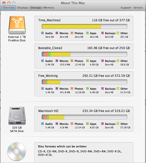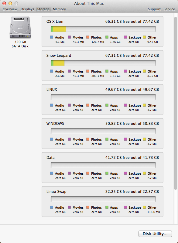 Anyway , just was curious of the hard drive and what experienced Mac users have found...How much hard drive do you use? I just assumed since 320 was what it came with, that was fine. Some people tell me youll never come close to filling that, but I dont have a lot on my computer right now (just 4000 songs and maybe <1000 photos and a few minutes of video) and it already says its 60gb+ full...so if I start taking a lot of photos and videos, wont it fill up quickly?