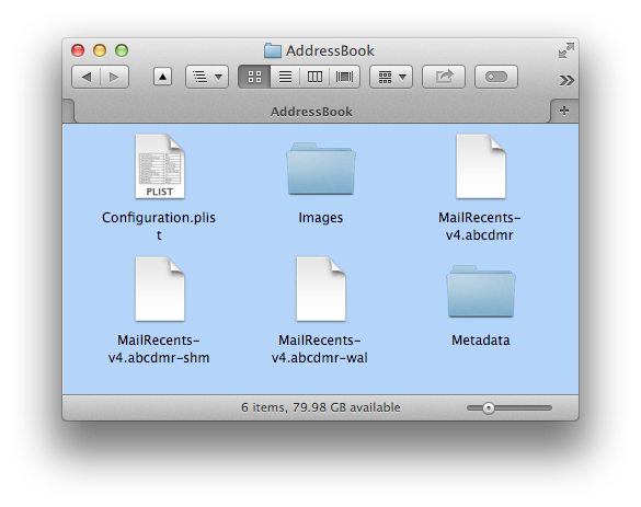Delete everything in AddressBook EXCEPT: Images, Metadata, Configuration.plist, and the three MailRecents files so it looks like this: