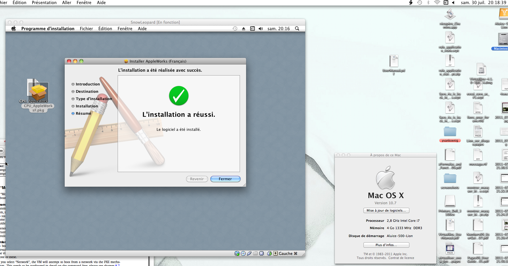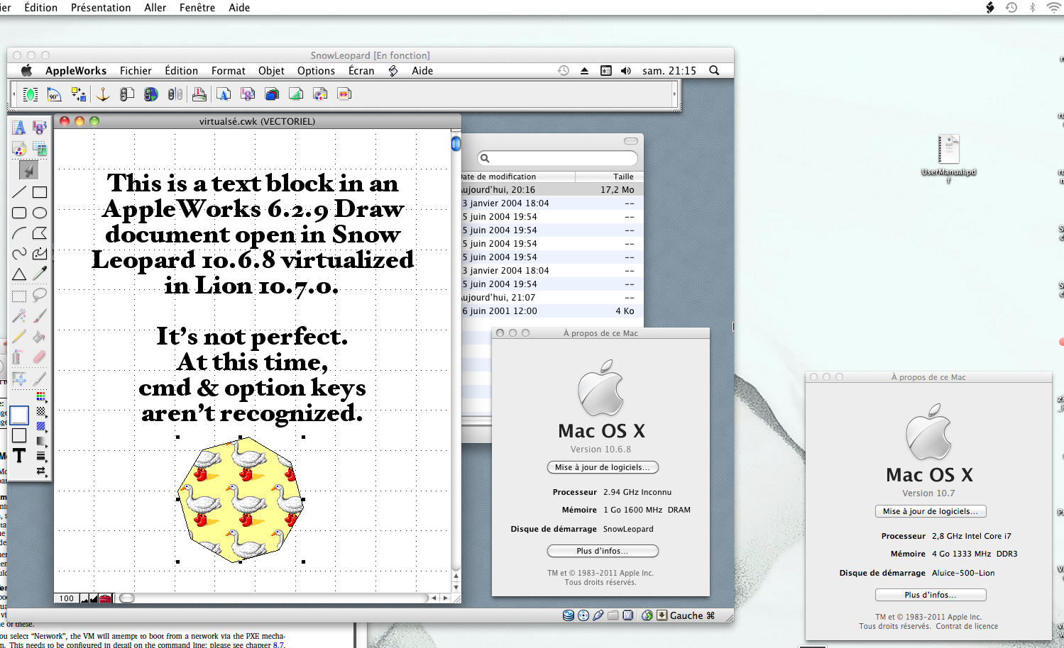 Thanks to VirtualBox 4.0, and thanks to HardMac, I was able to virtualize Snow Leopard in Lion so I may run AppleWorks with my Lion iMac.