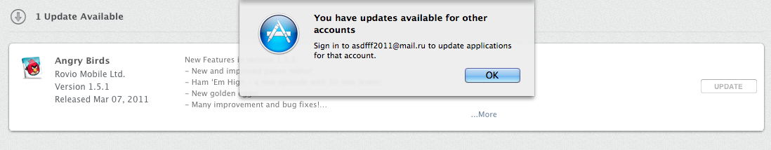 I have an app on the mac app Store that is not associated with my email or have not installed this app in my laptop? My mac app store says there is an update for angry birds but when I click on it it says that I my email is not associated with the account. asdfff2011@mail.ru