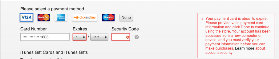 The Pic I grabbed of the iTunes "Page" showed my Card had run out of date (I don't seem to have been prompted as I still have "money" from redeemed gift card showing)