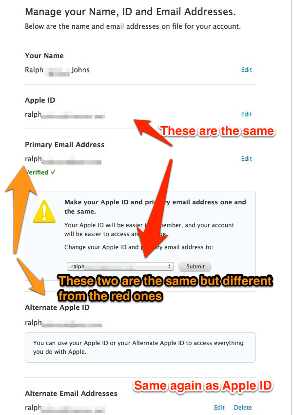 Separate to that (in some ways) I went to the Apple Profile page and edited the Primary email.