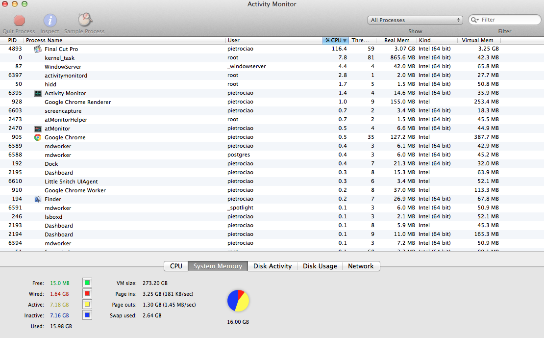 That's what happens in theory. What actually happens for applications like FCP is that there will be about 1G of free memory with 6G inactive memory (on an 8G system, the numbers are different but basically the same proportions on a 16G system). You'll add a couple of still images or try to do an effect and the free memory will plummet to a few MBs. The application will grind to a halt and become almost completely non-responsive, and the inactive memory will not release any more RAM. You can close the app and start up again, but it will still slowly wind down until you reboot or flush the inactive RAM with a utility. I have seen this many times in the Activity Monitor, and reported it multiple times, but it is an OS issue that Apple simply refuses to address or really even acknowledge.