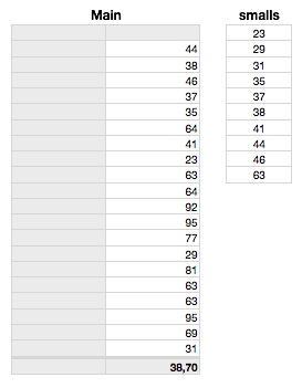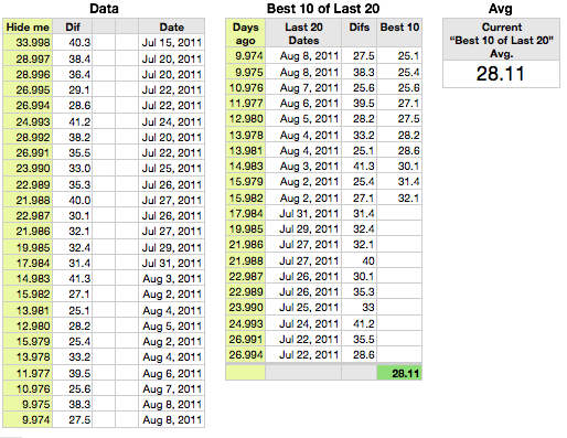 This collects the 20 smallest "days ago" numbers from column A of the Data table. Note that the numbers are slightly less than a whole number of days ago, due to the adjustment described above. If you want to display these, you may want to set the cell format to Number, with 0 decimal places.