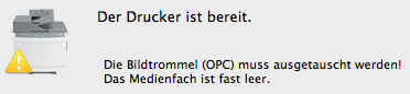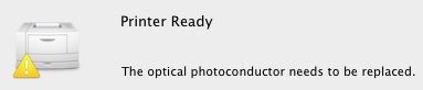 Everyone on this thread is quick to blame CUPS or Apple, but in my view, the printer firmware is the culprit. It simply should not be reporting warnings as errors. Sure, the driver can be "fixed" (ie "broken", technically speaking) to treat that specific reported "error" as "a status reminder, not an actual error", but printers shouldn't lie about what's wrong with them. I have a lot of sympathy for folks who have to write the drivers for devices that are sloppy with SNMP. Basically, you have to accomodate the bugs in certain firmware versions of certain printers in order to overlook what that device says is going on, because it probably isn't true. Except sometimes it might be...