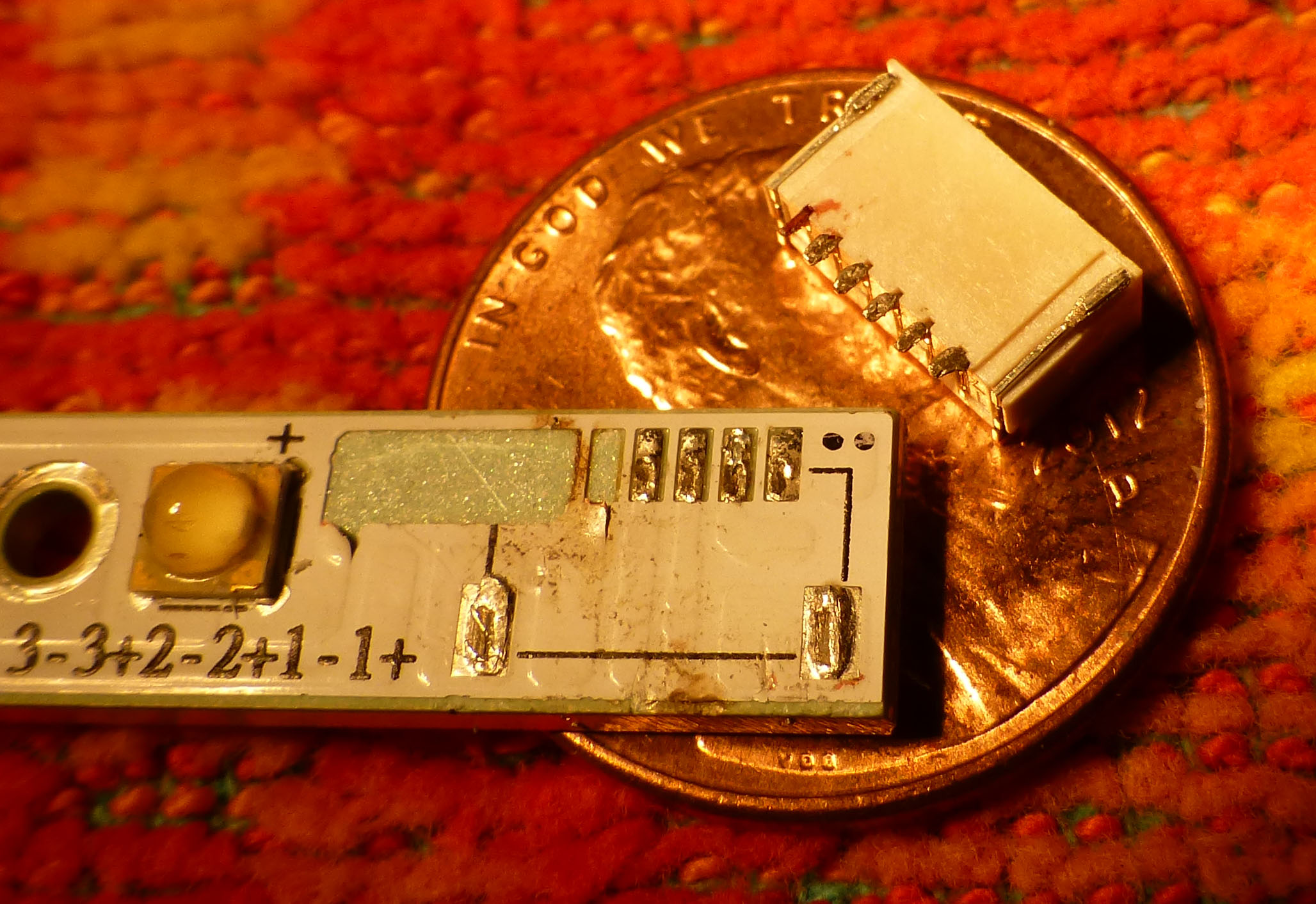 I stripped back the tape to reveal the connector and pushed down on it with moderate force. I felt it move and I smugly put the machine back together thinking I had fixed the problem. Once the machine came on the left side was still dark and I later found out that I had pressed hard enough for the connecter on the LED strip to become dismounted. This is what you are dealing with. Yes, that is a penny in the background.
