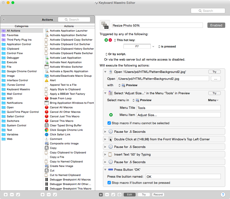 I want to "record" a short series of key and mouse actions, save them as a set of actions, and replay them (on a new document/file) - over and over. The particular application is Fireworks, on an open .png image file, but the basic need applies to any kind of file that's open in any application. Here it would be a series of actions like: go to the menubar, click on an item; click on a sub-menu item to bring up its window; tab twice; type a value; key "return" (for ok)