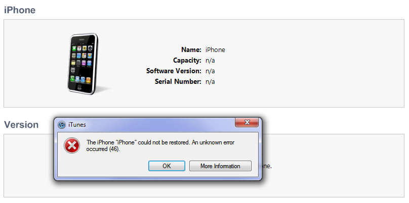 "The iPhone "iPhone" could not be restored. An unknown error occurred (46)."