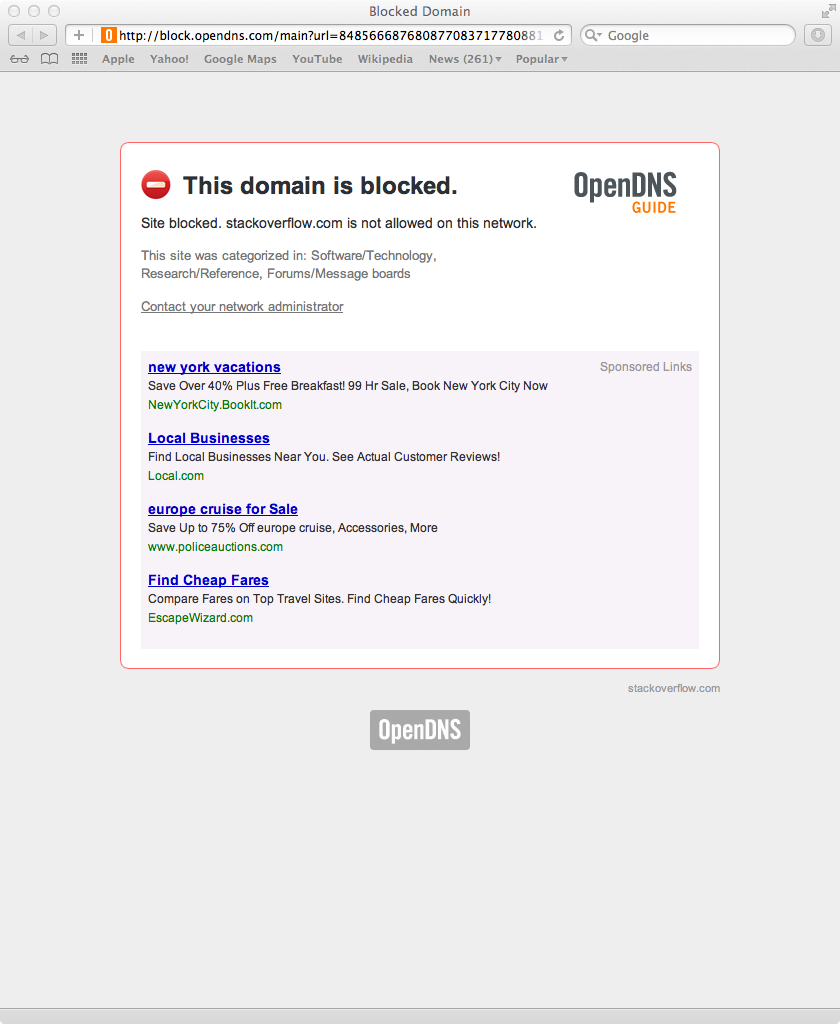 It doesn't make much sense to me: Stackoverflow is a network for discussing programming questions etc. Why is it being blocked? Also, what does opendns have to do with me?