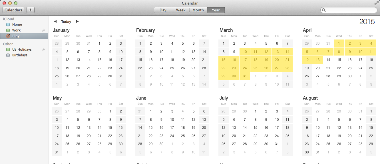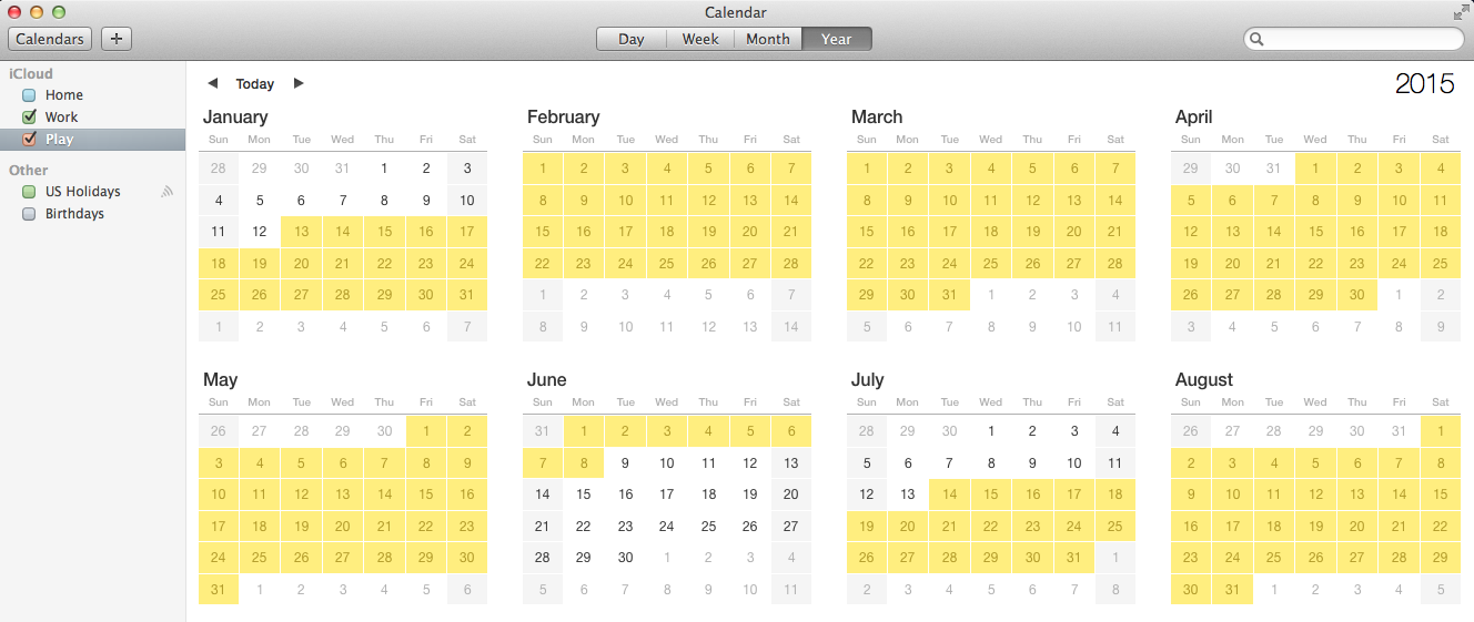 I understand the color coding for individual calendars, but in Year-View multi-day events created on different "Calendars" within iCal all show Yellow even though Yellow is not a Color Code for either of the displayed calendars.