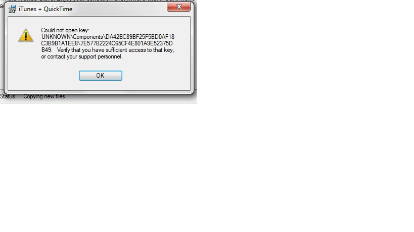 I'm getting the same message, I unistalled all Apple software, updater etc and even itunes (stupidly I fear). I was hopeful when I found a supposed fix on Cnet but without itunes I could not apply it. Luckily I have backed up my Iphone 4 but i'm extremely frustrated. BTW I'm running Windows 7 64-bit on a 1 year old Dell