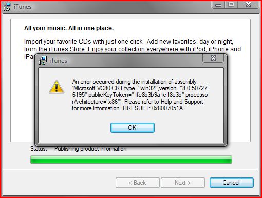 I unistalled iTunes and I get the same error messaage when I attempt to reinstall. My itunes is now completely gone!
