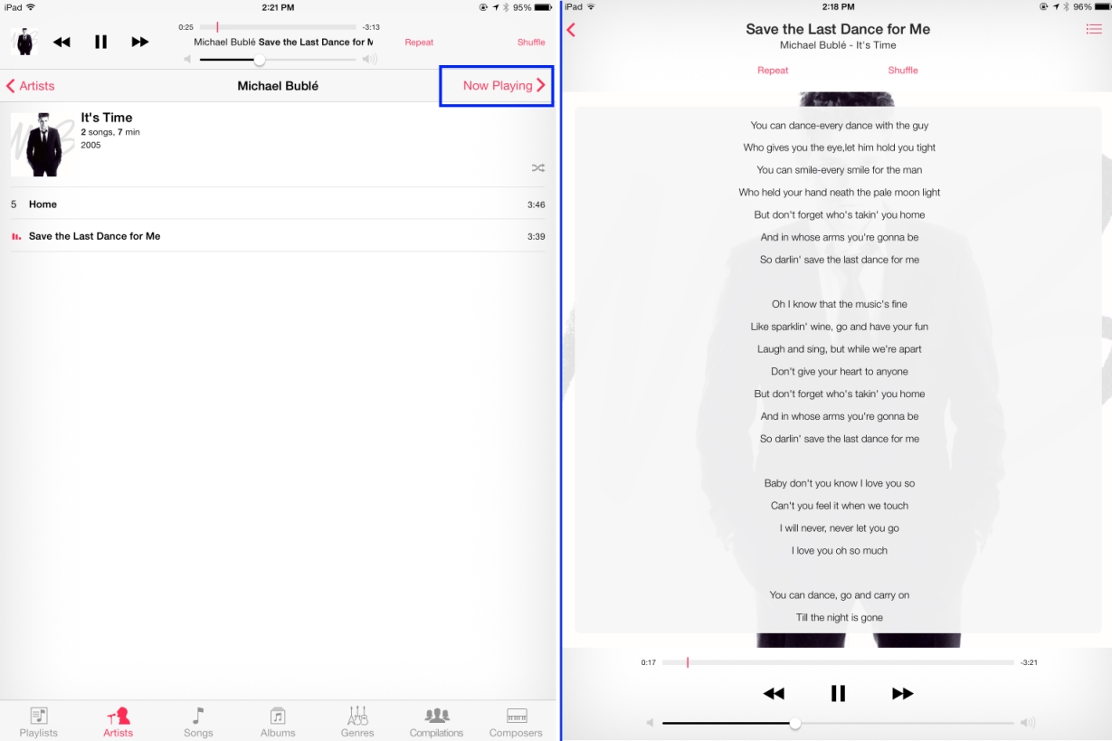 Display the album cover by tapping the thumbnail at the top of the screen. Lyrics appear if you’ve added them to the song using the song’s Info window in iTunes." If it is a bug, when will it be fixed? If it is no bug, then I want to go back to its 4.3.5. Can anybody tell me how that would work?