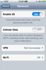 Turning Cellular Data off turns cellular data or internet access off entirely via the carrier's cellular network - via 3G, EDGE, or GPRS.