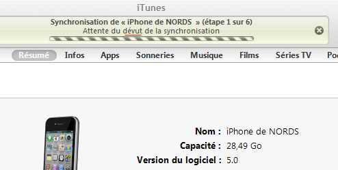 there's a mistake in the new itunes 10.5. In french, when the synchronisation begin, we have the translation Etape 1 sur 6 "Attente du dévut de la synchronisation instead of "Attente du début de la synchronisation"