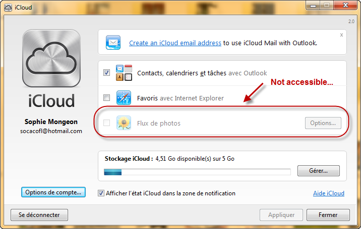 I have windows vista. When i first installed icloud it worked fine. my husband then got an iphone so i made a new user account on the pc so he could have his own photostream. I found after doing this I had the same problem as you on my original account (can't check photodstream on control panel). So i made a new user account for myself. Our PC now has general (my old user account), Rob and Alex. The general account has the same problem as you, Alex and Rob work......to a degree.