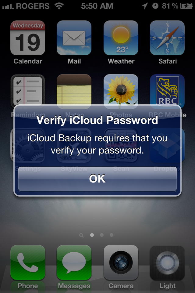 My iPhone 4 repeatedly pops open a notification to verify my password for iCloud backup. It reads something like "iCloud backup requires that you verify your password". It happens once or twice a day, usually first thing in the morning (after it has been charging overnight). Is this a bug, or have I missed something in my settings?
