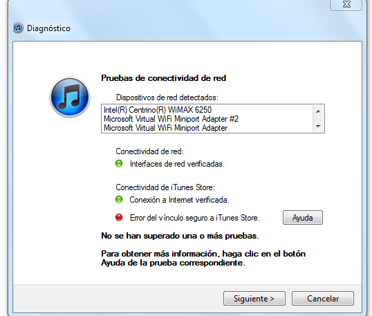 Hola. Tengo un problema con iTunes Store no puedo entrar pero mi conexion esta bien. Ejecute el diagnostico de iTunes y en las Pruebas de conectividad de red paso todas excepto una: "Error del vinculo seguro a iTunes Store" Como lo puedo resolver? Muchas Gracias.User uploaded file