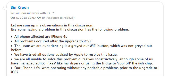 I am one of the dissapointed apple users. My iphone 4s worked flawesly. One day I decided to update to ios 6.1.3 and wifi started to causing me headaches. It didn't keep the wifi signal and when I was doing a fresh install the wifi button was going grey. My suspicions for software failure became stronger when I finally updated to ios 7 and then I lost comlpetelly wifi and also - new one - the bluetooth.