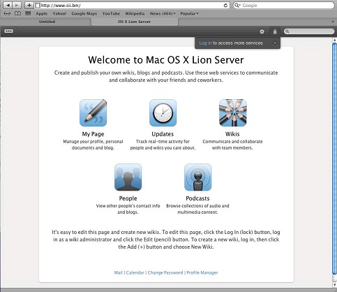 I have a MacBookPro with Lion software installed. All of my software is up to date. I have tried accessing the site (www.sii.bm) from a Windows machine outside the network and get the same message. I am wondering if it has something to do with the SonicWall that controls traffic or a setting on the MacMini Server. I note that I have not yet changed the webpage from the standard Welcome to MacOSX that comes with the server.