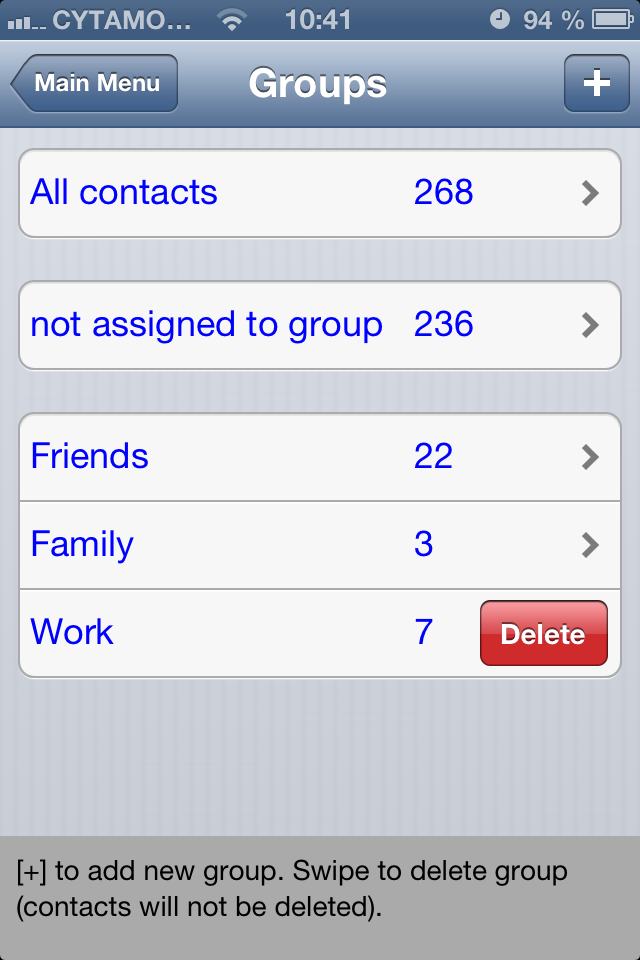 Swipe group to delete - only group itselt will be deleted, not the contacts! Then you can create new groups, assign contacts to group directly on iPhone, no need for PC connection. The groups which are created are "native" iPhone groups and you will see them in any other applications (e.g. in native iPhone address book).