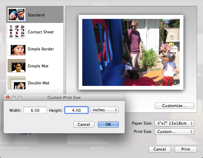 I bought some picture frames with mats but the mats aren't the standard 4x6 size but rather 4.5 x 6.5. I asked Costco if they could make the pictures print that size and they said no, I would have to edit the photos to be a 5x7 size with the actual picture 4.5 x 6.5. There would be white space around the 4.5 x 6.5 picture that would take up the space to make it print in 5.7 format. I don't know how to do that in iPhoto of if iPhoto really even supports that kind of editing. Does anyone know how to do that?