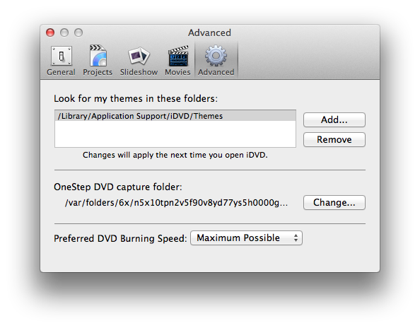 So I copied the themes 1-5 from the Application Support/iDVD/Themes folder that I have on my older MBP with Snow Leopard. I then copied those themes into the Themes folder on my new MBP. I did a repair permissions from disk utility and rebooted. However when I open up iDVD themes from 6 and 7 are ok but the old themes all appear just as a yellow triangle. There seems to be a broken link there somewhere.