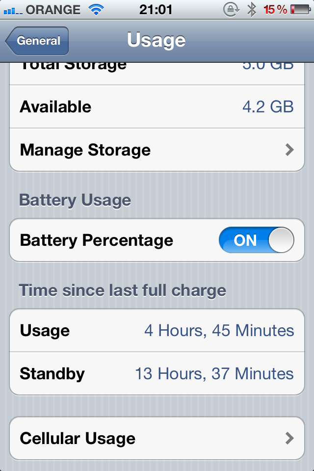 Today, with regular usage, rougly 2hours listening to music, periodic texting, a good hour or so playing Temple Run, these are my battery statistics: