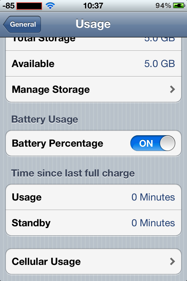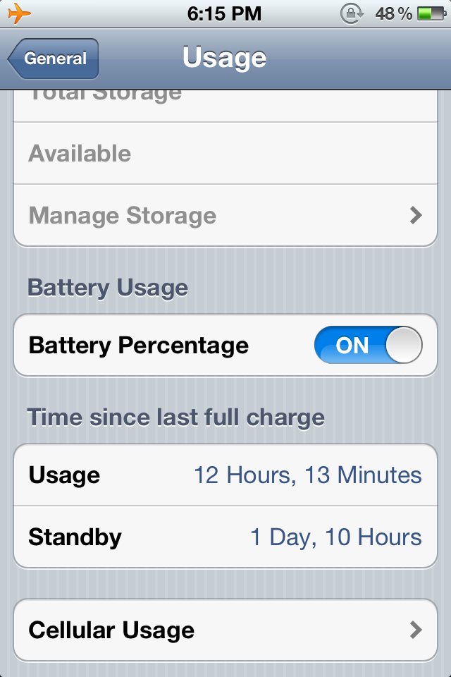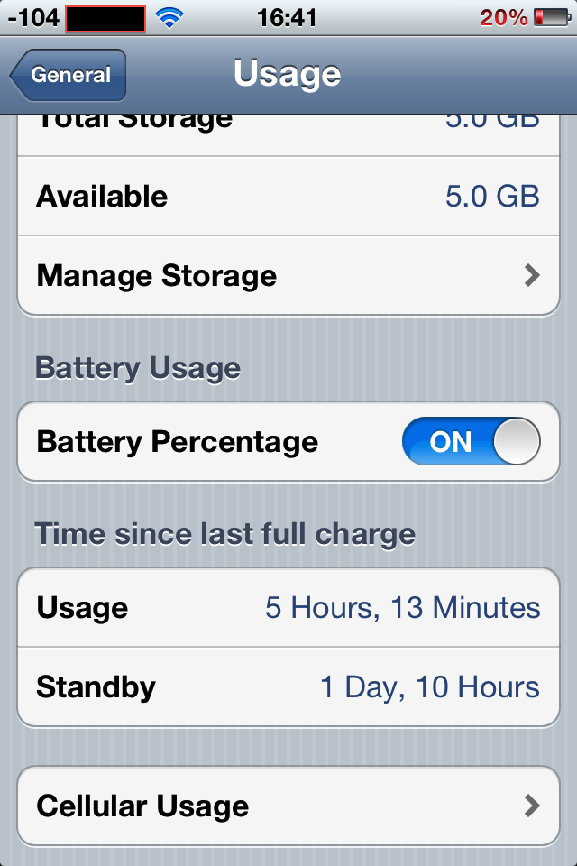 After that, with no iPhone resets or restores or other fancy stuff, I saw my battery usage pop right up again. At the moment, my Usage reports 4 hours 33 minutes and Standby 22 hours 30 minutes. The battery is at 35%, so that multiplies out to an expected Usage at this rate of 420 minutes = 7 hours at a Standby of 1 day 10 hours. That was also fairly typical for me before iOS 5. If it were over just one day, it would probably be closer to 8 hours of Usage.