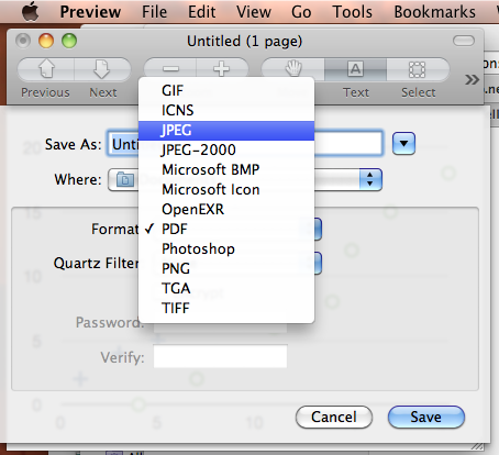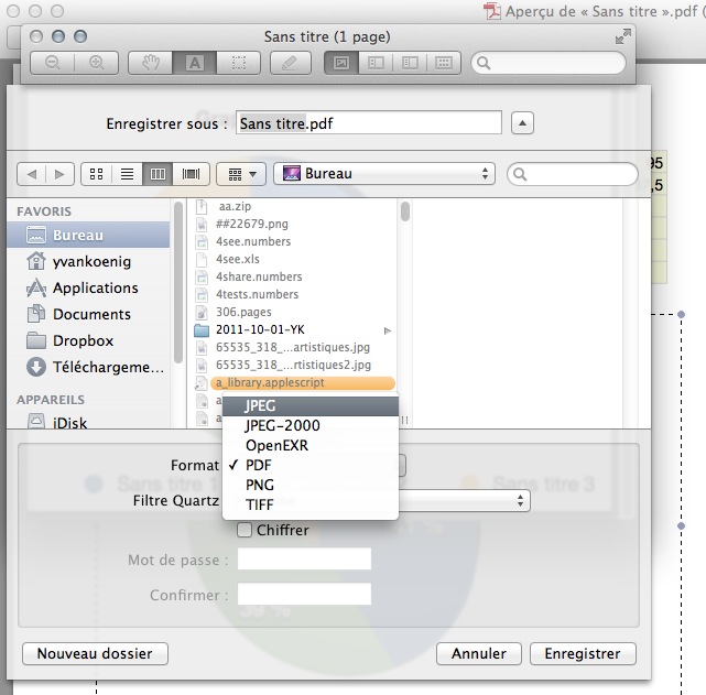 Il ouvre le dialogue Enregistrer (Enregistrer… sous Lion) puis fixe le format à JPEG.