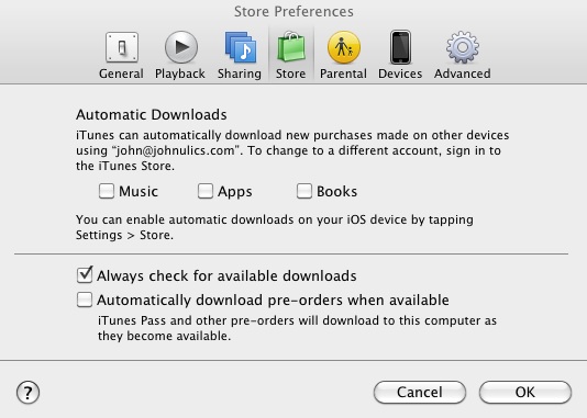 oh yeah, VERY IMPORTANT... forgot to tell you that you have to be signed in to your itunes store account to make these changes, or to even see what the current settings are. If you are not signed in to your itunes account the whole pane will be dimmed and will show all boxes unchecked... HOWEVER, once you sign in to your account and open the store pane, you will be able to see the current settings AND the "Always check for available downloads box is checked by default.